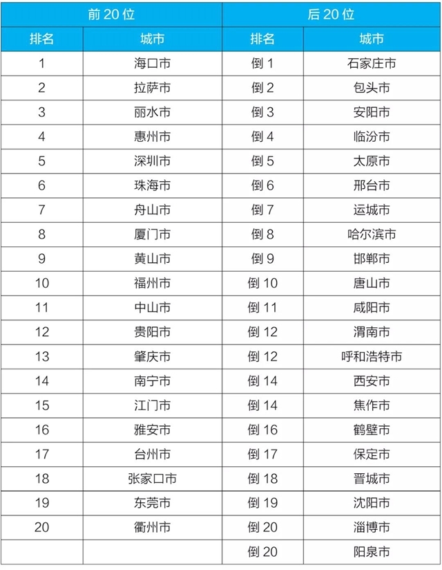 1-4月,168個(gè)重點(diǎn)城市中石家莊、包頭、安陽(yáng)市等城市空氣質(zhì)量相對(duì)較差(從倒數(shù)第1名至并列倒數(shù)第20名);???、拉薩、麗水市等城市空氣質(zhì)量相對(duì)較好(從第1名至第20名,見(jiàn)附表6)。