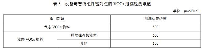 5.5.2泄漏認(rèn)定出現(xiàn)下列情況之一,則認(rèn)定發(fā)生了泄漏:a)密封點(diǎn)存在滲液、滴液等可見的泄漏現(xiàn)象;b)設(shè)備與管線組件密封點(diǎn)的VOCs泄漏檢測(cè)值超過表3規(guī)定的VOCs泄漏認(rèn)定濃度。