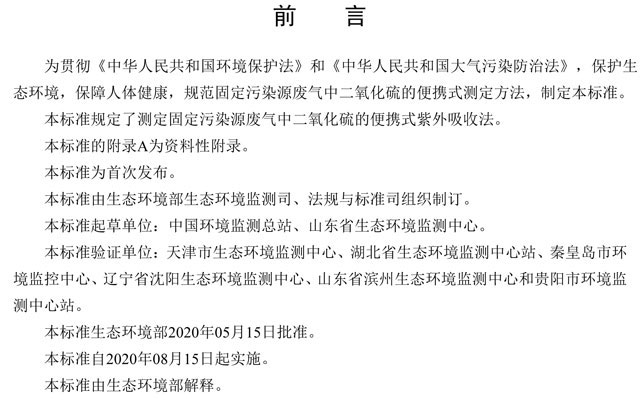 為貫徹《中華人民共和國環(huán)境保護(hù)法》和《中華人民共和國大氣污染防治法》,保護(hù)生態(tài)環(huán)境,保障人體健康,規(guī)范固定污染源廢氣中二氧化硫的便攜式測(cè)定方法,制定本標(biāo)準(zhǔn)。本標(biāo)準(zhǔn)規(guī)定了測(cè)定固定污染源廢氣中二氧化硫的便攜式紫外吸收法。本標(biāo)準(zhǔn)的附錄A為資料性附錄。本標(biāo)準(zhǔn)為首次發(fā)布。