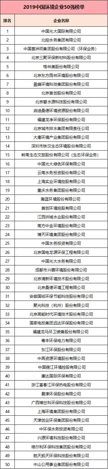 附:2019中國環(huán)境企業(yè)50強(qiáng)榜單