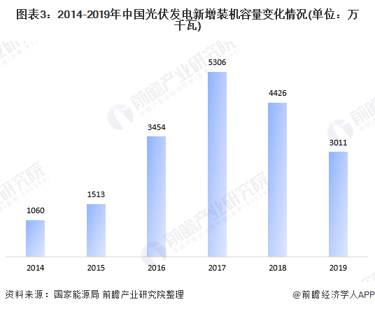 據(jù)國家能源局統(tǒng)計(jì)數(shù)據(jù)顯示,2017年,我國光伏發(fā)電新增裝機(jī)容量為5306萬千瓦,創(chuàng)歷史新高。2018年之后,受光伏531新政影響,各地光伏發(fā)電新增項(xiàng)目有所下滑。2019年,全國新增光伏發(fā)電裝機(jī)3011萬千瓦,同比下降31.6%。累計(jì)裝機(jī)容量已增長至20430萬千瓦。