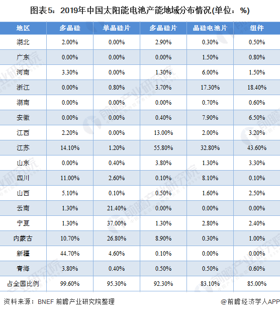 太陽能電池主要由多晶硅、單晶硅片、多晶硅片、晶硅電池片等組成,從區(qū)域分布來看,2019年我國太陽能電池相關(guān)組件的產(chǎn)能分布較為廣泛,多晶硅和硅片的產(chǎn)能主要集中在電價(jià)更低的西部地區(qū),尤其是新疆、四川、寧夏、云南等地。電池片和組件主要集中在東部地區(qū),如浙江和江蘇,兩者產(chǎn)能占全國產(chǎn)能比重超過60%。