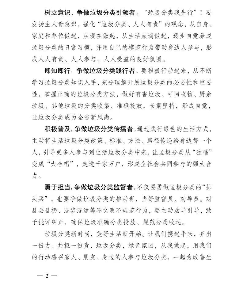 垃圾分一分,生活美十分。習(xí)近平總書記指出,垃圾分類就是新時(shí)尚;推行垃圾分類,關(guān)鍵是要加強(qiáng)科學(xué)管理,形成長(zhǎng)效機(jī)制,推動(dòng)習(xí)慣養(yǎng)成。實(shí)行垃圾分類是減少垃圾產(chǎn)生量、促進(jìn)資源回收、緩解環(huán)境壓力、改善生態(tài)環(huán)境的重要舉措,關(guān)系廣大人民群眾生活環(huán)境,關(guān)系節(jié)約使用資源,也是社會(huì)文明水平的一個(gè)重要體現(xiàn)。為響應(yīng)黨中央號(hào)召,推動(dòng)垃圾分類在我省更好落地落實(shí),到 2025 年全省地級(jí)以上城市基本建成生活垃圾分類處理系統(tǒng),我們向城鄉(xiāng)居民朋友們發(fā)出倡議,全社會(huì)人人動(dòng)手,讓我們的舉手之勞成為一種習(xí)慣,一種素養(yǎng),一種航標(biāo),一起為改善生活環(huán)境作努力,共建共享生態(tài)環(huán)保生活。