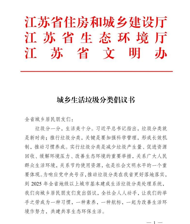 江蘇省住房和城鄉(xiāng)建設(shè)廳、江蘇省生態(tài)環(huán)境廳、江蘇省文明辦近日聯(lián)合發(fā)出倡議,從我做起,一起為改善生活環(huán)境作努力,共建共享生態(tài)環(huán)保生活。提倡廣大城鄉(xiāng)居民樹立意識(shí),爭(zhēng)做垃圾分類引領(lǐng)者;即知即行,爭(zhēng)做垃圾分類?ài)`行者;積極普及,爭(zhēng)做垃圾分類傳播者;勇于擔(dān)當(dāng),爭(zhēng)做垃圾分類監(jiān)督者。