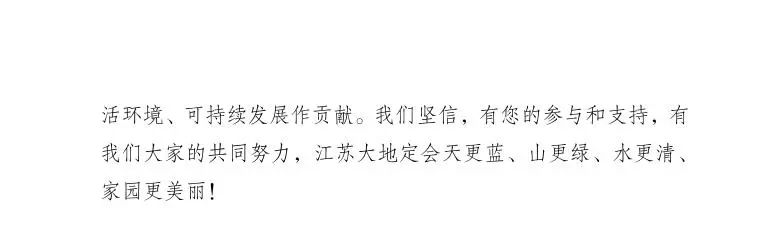 垃圾分類新時(shí)尚,美好生活新開始。讓我們攜起手來(lái),齊出一份力、共擔(dān)一份責(zé),垃圾分類,綠色家園,從我做起,用我們的行動(dòng)感召家人、朋友、身邊的人參與垃圾分類,一起為改善生活環(huán)境、可持續(xù)發(fā)展作貢獻(xiàn)。我們堅(jiān)信,有您的參與和支持,有我們大家的共同努力,江蘇大地定會(huì)天更藍(lán)、山更綠、水更清、家園更美麗!