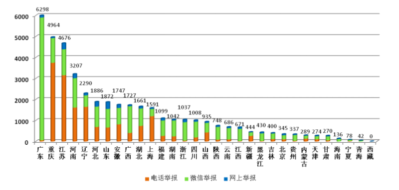 從各地區(qū)不同渠道舉報(bào)數(shù)量看,廣東、重慶、江蘇、河南等地舉報(bào)總量居前,重慶、上海等地電話舉報(bào)占比較高,廣東、浙江、江西、黑龍江等地微信舉報(bào)占比較高。