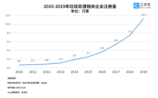 隨著城鎮(zhèn)化進程的加快和消費水平的提升,生活垃圾產(chǎn)生量逐年攀升,與垃圾處理相關的企業(yè)數(shù)量也逐年增長。企查查數(shù)據(jù)顯示,過去十年來我國垃圾處理相關的企業(yè)注冊量不斷增長,2018年相關企業(yè)注冊量為7.4萬,2019年相關企業(yè)注冊量為11.3萬,同比增長52.7%。
