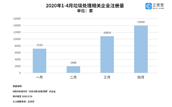 2020年1月至4月,我國垃圾處理相關的企業(yè)注冊量為3.4萬家。其中三月份注冊量為1.1萬,環(huán)比上漲444.2%;四月份注冊量為1.4萬,環(huán)比上漲28.8%。去年同期(2019年1月至4月),我國垃圾處理相關的企業(yè)注冊量為3.1萬家。相比去年,今年1月至4月我國垃圾處理相關的企業(yè)注冊量同比上漲9.6%。