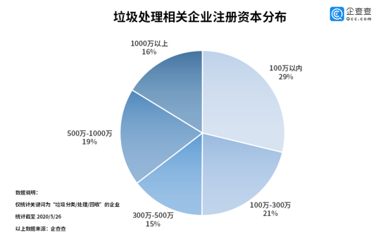 從企業(yè)注冊資本分布來看,企查查數(shù)據(jù)顯示,我國垃圾處理相關的企業(yè)注冊資本分布在300萬以內(nèi)的企業(yè)數(shù)量最多,占比50%,500萬-1000萬的占比19%,1000萬以上的占比16%。