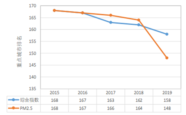 2015年保定綜合指數(shù)和PM2.5年均濃度在168個重點城市排名倒一,2019年保定綜合指數(shù)在168個重點城市排名倒數(shù)11,PM2.5年均濃度在168個重點城市排名倒21,較2015年有明顯進步。