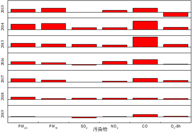 2013-2019年保定市與“2+26”城市六項污染物距平圖