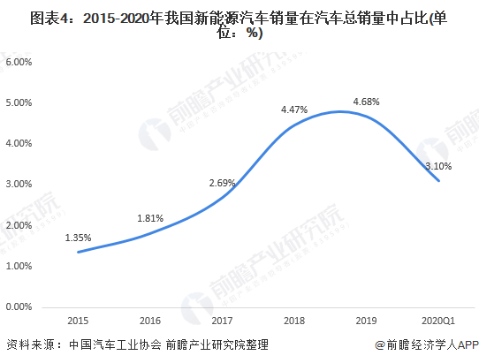 目前,新能源汽車在我國普及程度并不高,其銷量在我國汽車整體銷量中的占比也較小。2019年我國汽車銷量為2576.9萬輛,其中新能源汽車銷量為120.6萬輛,在汽車總銷量中占比僅有4.68%。2020年一季度,受疫情影響,下游消費銳減,我國汽車市場整體較為疲軟,原本并非主流車型的新能源汽車銷量更是低迷,其銷量占比下降至3.10%。