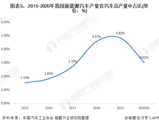 產(chǎn)量占比方面,2019年,我國新能源汽車產(chǎn)量為124.2萬輛,在汽車總產(chǎn)量中占比僅有4.83%,同樣不足5%。隨后2020年一季度,疫情影響下我國新能源汽車產(chǎn)量占比下跌至3.02%。