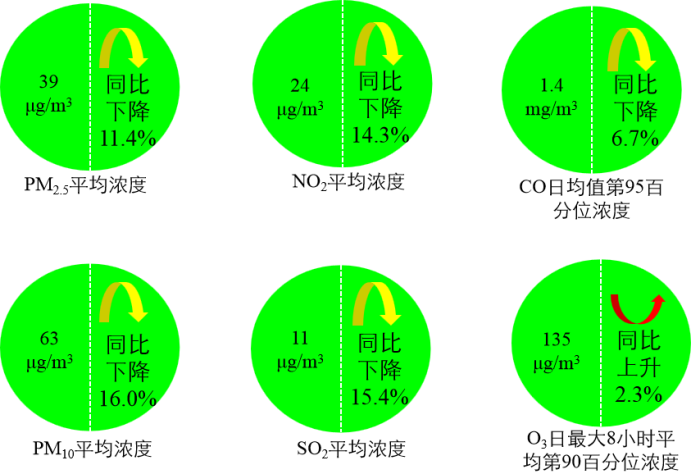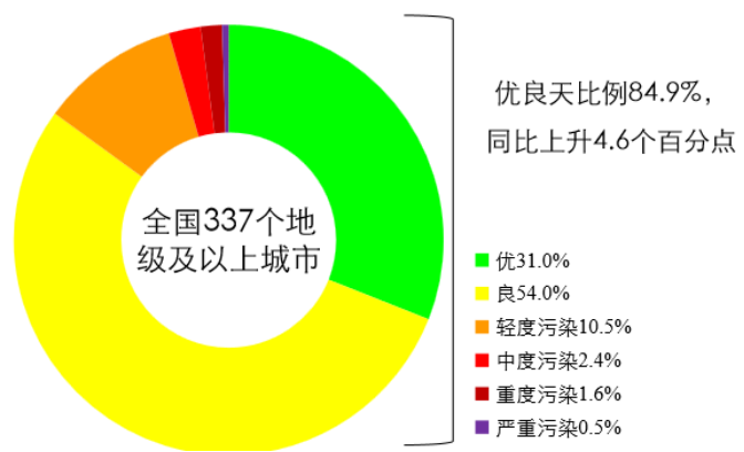 1-5月,全國(guó)337個(gè)地級(jí)及以上城市平均優(yōu)良天數(shù)比例為84.9%,同比上升4.6個(gè)百分點(diǎn);145個(gè)城市環(huán)境空氣質(zhì)量達(dá)標(biāo),同比增加27個(gè);PM2.5濃度為39微克/立方米,同比下降11.4%;PM10濃度為63微克/立方米,同比下降16.0%;O3濃度為135微克/立方米,同比上升2.3%;SO2濃度為11微克/立方米,同比下降15.4%;NO2濃度為24微克/立方米,同比下降14.3%;CO濃度為1.4毫克/立方米,同比下降6.7%。