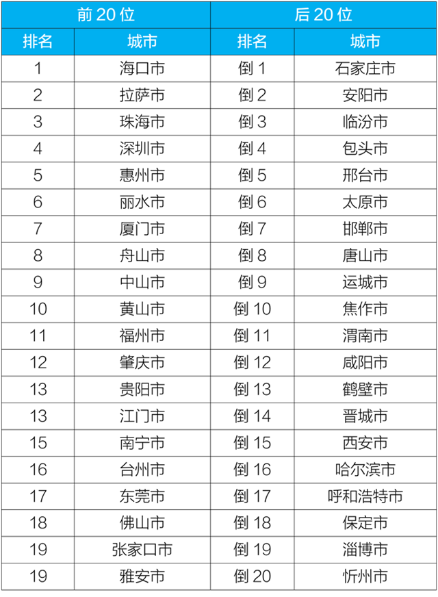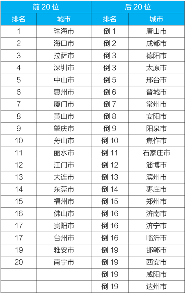 5月,168個(gè)重點(diǎn)城市中唐山、成都、德陽(yáng)市等城市空氣質(zhì)量相對(duì)較差(從倒數(shù)第1名至并列倒數(shù)第19名);珠海、???、拉薩市等城市空氣質(zhì)量相對(duì)較好(從第1名至第20名,見附表5)。