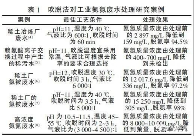 通過對比分析表1 可以得出:(1)吹脫法普遍適宜的pH 在11 附近;(2)考慮經(jīng)濟因素,溫度在30~40 ℃附近較為可行,且處理率高;(3)吹脫時間為3 h左右;(4)氣液比在5 000∶1 左右效果較好,且吹脫溫度越高,氣液比越小;(5)吹脫后廢水的濃度可降低到中低濃度;(6)脫氮率基本保持90%以上。盡管吹脫法可以將大部分氨氮脫除, 但處理后的廢水中氨氮仍然高達100 mg/L 以上,無法直接排放,還需要后續(xù)深度處理