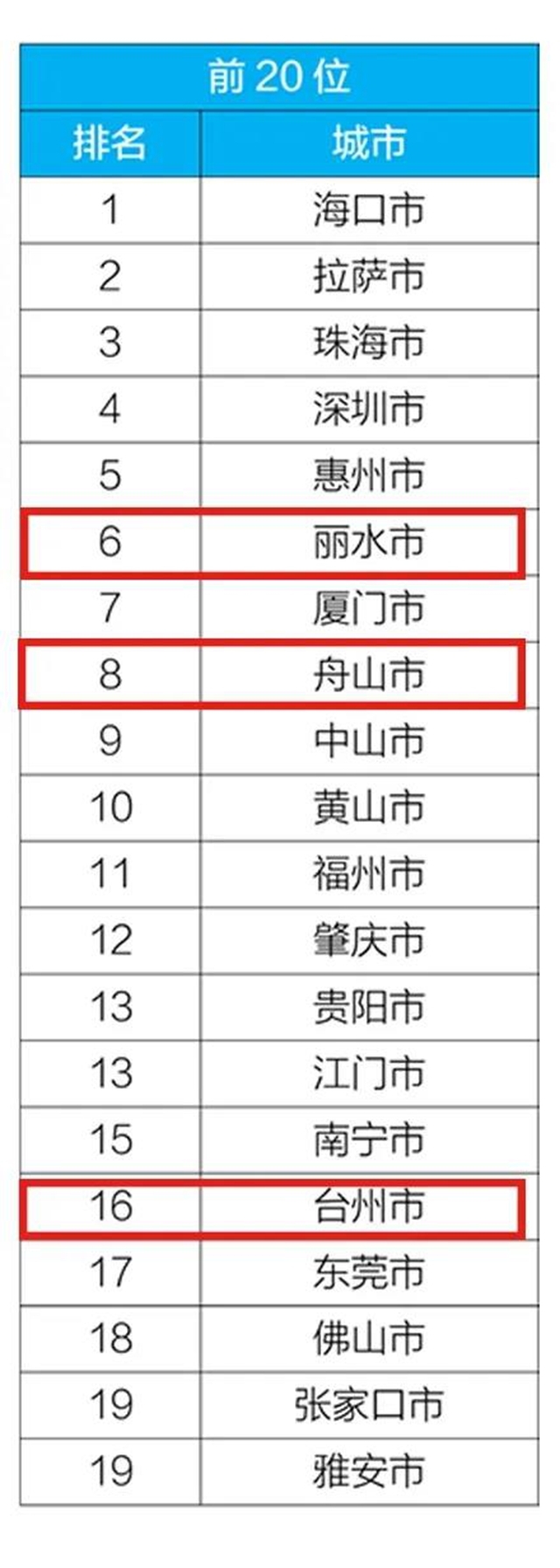 168個重點城市空氣質(zhì)量排名前20位中我省占3席,分別是:麗水市、舟山市、臺州市。
