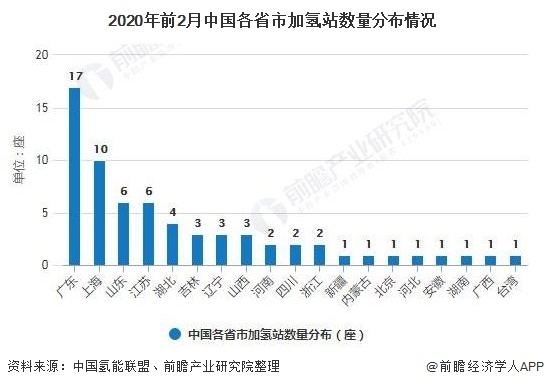 值得注意的是,中國(guó)加氫站數(shù)量雖有迅速增加,截至2020年2月,我國(guó)加氫站共有66座,仍有較大上升空間。廣東省以17座的數(shù)量排在首位,其次是上海市,擁有10座加氫站。