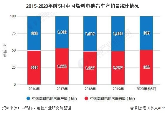 中汽協(xié)數(shù)據(jù)顯示,燃料電池汽車產(chǎn)銷分別完成2833輛和2737輛,同比分別增長(zhǎng)85.5%和79.2%。從2016年到2019年,國(guó)內(nèi)燃料電池汽車銷量逐年增加。或受到疫情影響,截止至2020年1-5月中國(guó)燃料電池汽車產(chǎn)銷分別完成309輛和322輛,同比分別下降44.1%和40.9%。