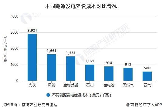 從不同能源的燃油熱值與發(fā)電建設(shè)成本方面考慮,氫能源均具優(yōu)勢(shì)。從燃料熱值角度看,氫能源高于天然氣、汽油、煤和乙醇等其他能源。氫氣燃料熱值幾乎是其他化石燃料的3倍多。從發(fā)電建設(shè)成本來(lái)講,氫能源發(fā)電建設(shè)成本最低。 EIA數(shù)據(jù)顯示,氫氣發(fā)電建設(shè)成本僅580美元/千瓦,在光伏、風(fēng)能、天然氣、 生物質(zhì)能、石油發(fā)電等眾多方式中成本最低。