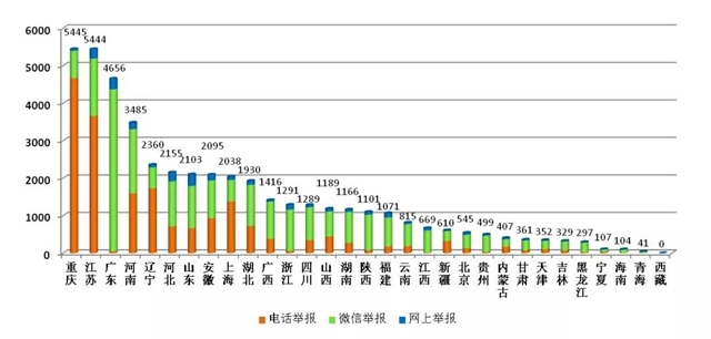 從各地區(qū)不同渠道舉報數(shù)量看,重慶、江蘇、廣東等地舉報總量居前,重慶、江蘇、遼寧等地電話舉報占比較高,廣東、浙江、江西等地微信舉報占比較高。