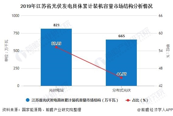 從光伏發(fā)電市場結(jié)構(gòu)來看,目前,江蘇省光伏發(fā)電仍以光伏電站為主。截至2019年底,全省光伏電站累計裝機容量為821萬千瓦,占光伏總裝機容量的55.25%;分布式光伏累計裝機容量為665萬千瓦,占光伏總裝機容量的44.75%。