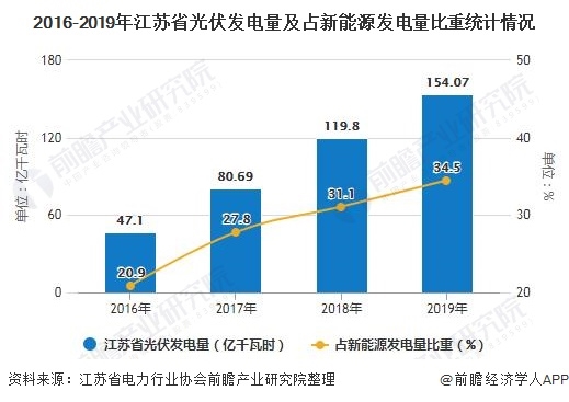 據(jù)江蘇省電力行業(yè)協(xié)會統(tǒng)計數(shù)據(jù)顯示,2016年以來,江蘇省光伏發(fā)電量穩(wěn)步增長,2016年,全省光伏發(fā)電量僅為47.1億千瓦時,到2019年,已增長至154.07億千瓦時。另外,光伏發(fā)電在江蘇省新能源發(fā)電中的市場份額也在逐步提升,2019年,江蘇省光伏發(fā)電量占新能源發(fā)電量的比重已提升至34.5%。