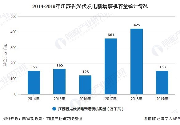 據(jù)國家能源局統(tǒng)計數(shù)據(jù)顯示,2014年,江蘇省累計裝機容量僅257萬千瓦,到2018年,全省光伏發(fā)電累計裝機容量突破1000萬千瓦,達(dá)到1332萬千瓦,同比增長46.9%。受光伏補貼退坡等政策影響,從目前裝機容量來看,2019年增速較前幾年有所下降。