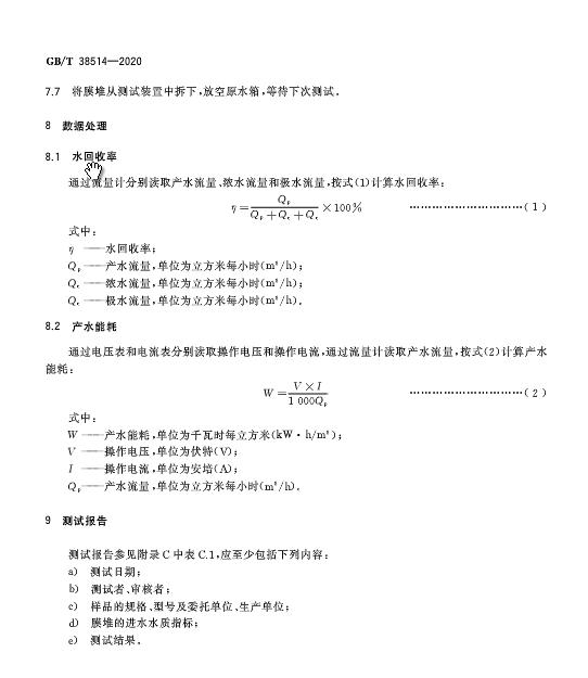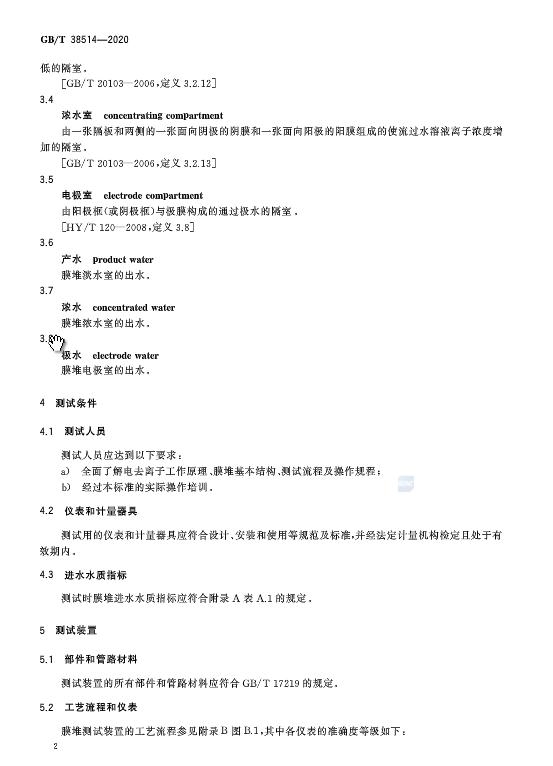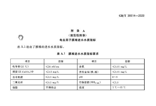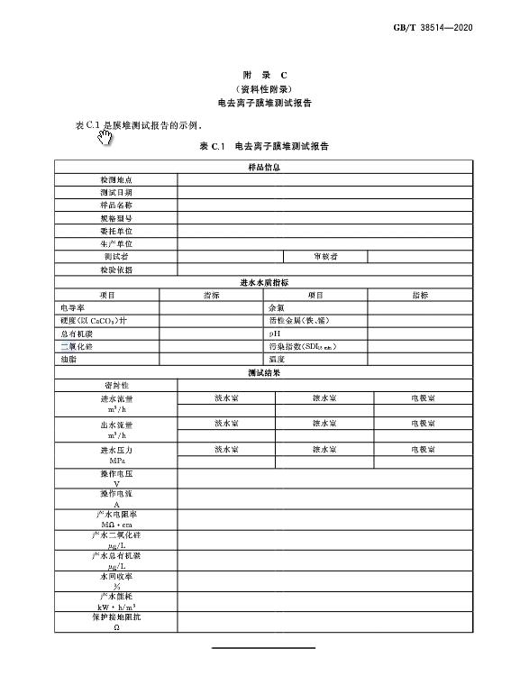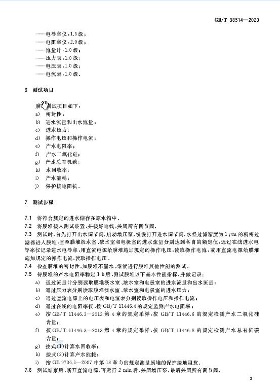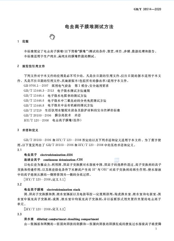 《電去離子膜堆測試方法》GB/T 38514-2020發(fā)布,2021年2月1日起施行