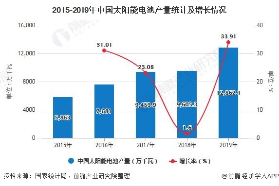 1、2019年中國(guó)太陽(yáng)能電池產(chǎn)量突破億千瓦
