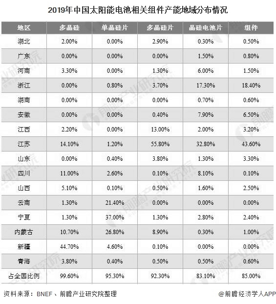 太陽(yáng)能電池主要由多晶硅、單晶硅片、多晶硅片、晶硅電池片等組成,從區(qū)域分布來(lái)看,2019年我國(guó)太陽(yáng)能電池相關(guān)組件的產(chǎn)能分布較為廣泛,多晶硅和硅片的產(chǎn)能主要集中在電價(jià)更低的西部地區(qū),尤其是新疆、四川、寧夏、云南等地。電池片和組件主要集中在東部地區(qū),如浙江和江蘇,兩者產(chǎn)能占全國(guó)產(chǎn)能比重超過(guò)60%。