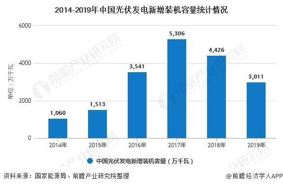 據(jù)國(guó)家能源局統(tǒng)計(jì)數(shù)據(jù)顯示,2017年,我國(guó)光伏發(fā)電新增裝機(jī)容量為5306萬(wàn)千瓦,創(chuàng)歷史新高。2018年之后,受光伏531新政影響,各地光伏發(fā)電新增項(xiàng)目有所下滑。2019年,全國(guó)新增光伏發(fā)電裝機(jī)3011萬(wàn)千瓦,同比下降31.6%。累計(jì)裝機(jī)容量已增長(zhǎng)至20430萬(wàn)千瓦。
