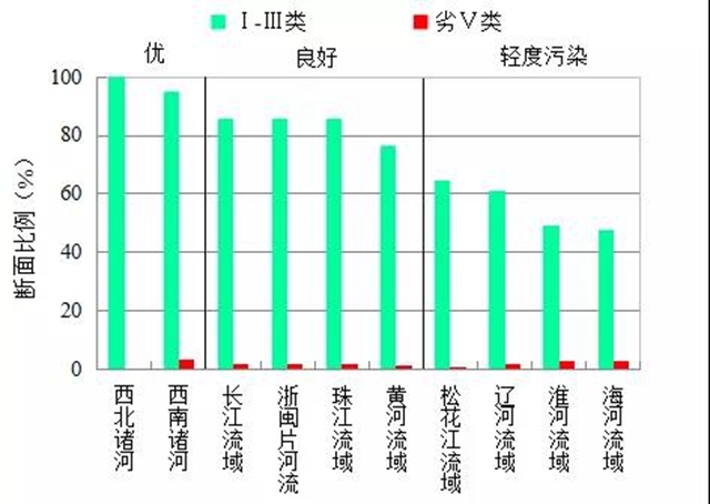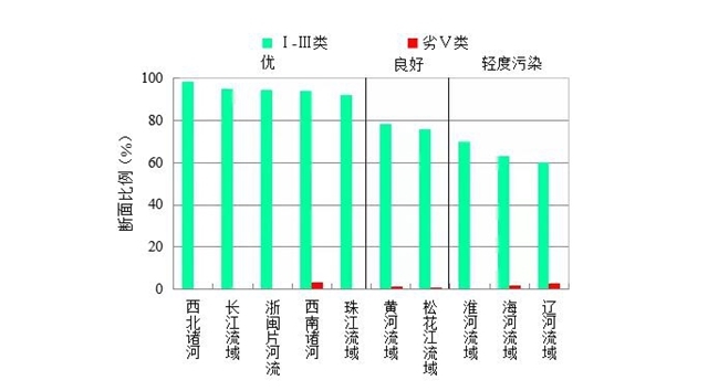 1-6月,長(zhǎng)江、黃河、珠江、松花江、淮河、海河、遼河等七大流域及西北諸河、西南諸河和浙閩片河流Ⅰ-Ⅲ類水質(zhì)斷面比例為83.8%,同比上升5.9個(gè)百分點(diǎn);劣Ⅴ類為0.7%,同比下降3.8個(gè)百分點(diǎn)。主要污染指標(biāo)為化學(xué)需氧量、高錳酸鹽指數(shù)和五日生化需氧量。其中,西北諸河、長(zhǎng)江流域、浙閩片河流、西南諸河和珠江流域水質(zhì)為優(yōu),黃河和松花江流域水質(zhì)良好,淮河、海河和遼河流域?yàn)檩p度污染。