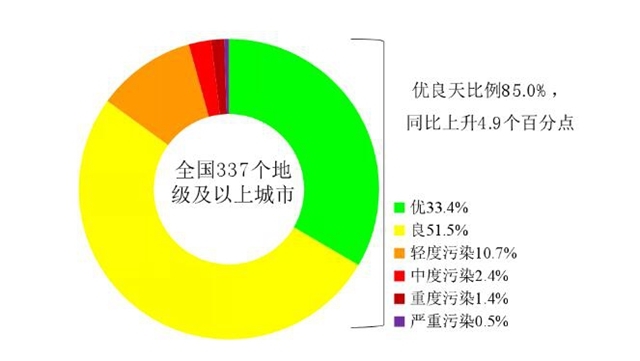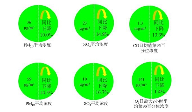 1-6月,全國(guó)337個(gè)地級(jí)及以上城市平均優(yōu)良天數(shù)比例為85.0%,同比上升4.9個(gè)百分點(diǎn);PM2.5濃度為36微克/立方米,同比下降10.0%;PM10濃度為59微克/立方米,同比下降14.5%;O3濃度為141微克/立方米,同比下降1.4%;SO2濃度為10微克/立方米,同比下降16.7%;NO2濃度為23微克/立方米,同比下降14.8%;CO濃度為1.3毫克/立方米,同比下降13.3%。