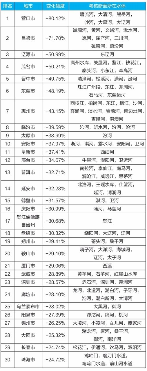 2020年1-6月國(guó)家地表水考核斷面水環(huán)境質(zhì)量變化情況排名前30位城市及所在水體
