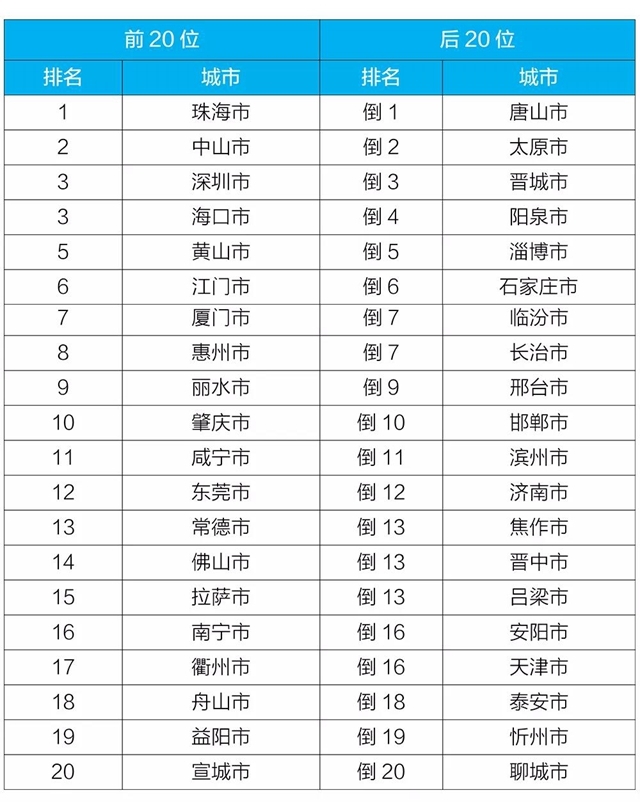 2020年6月168個(gè)重點(diǎn)城市環(huán)境空氣排名前20位和后20位城市名單