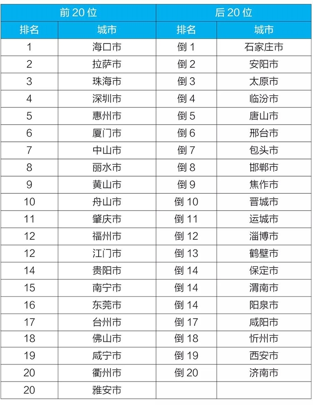 1-6月,168個(gè)重點(diǎn)城市中,石家莊、安陽(yáng)和太原市等城市空氣質(zhì)量相對(duì)較差(從倒數(shù)第1名至倒數(shù)第20名);???、拉薩、珠海市等城市空氣質(zhì)量相對(duì)較好(從第1名至并列第20名,見(jiàn)附表8)。