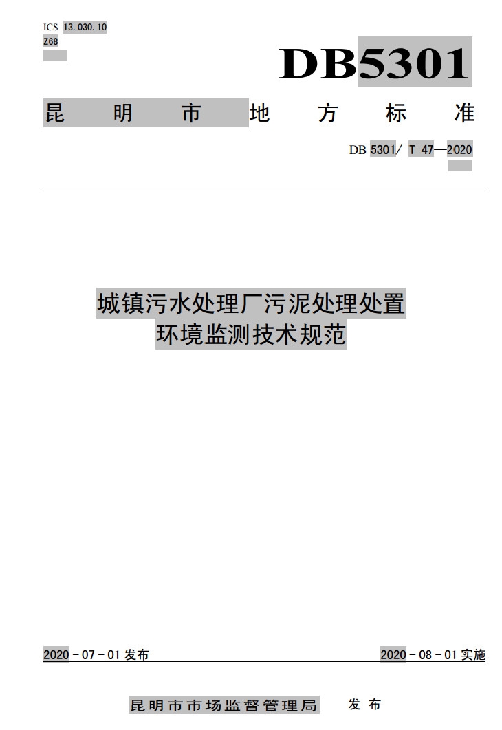 昆明市地方標準《城鎮(zhèn)污水處理廠污泥處理處置環(huán)境監(jiān)測技術(shù)規(guī)范》(DB 5301/ T 47—2020)于7月1日發(fā)布,將于2020年8月1日施行。