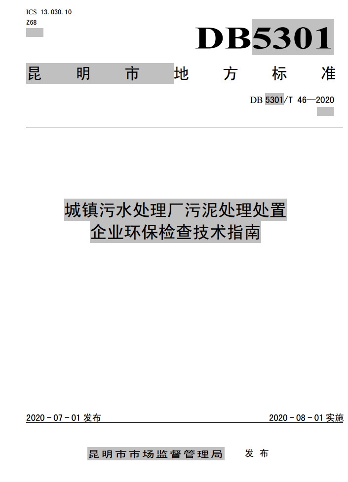 昆明市地方標準《城鎮(zhèn)污水處理廠污泥處理處置企業(yè)環(huán)保檢查技術(shù)指南》(DB 5301/T 46—2020)于7月1日發(fā)布,將于2020年8月1日起施行。