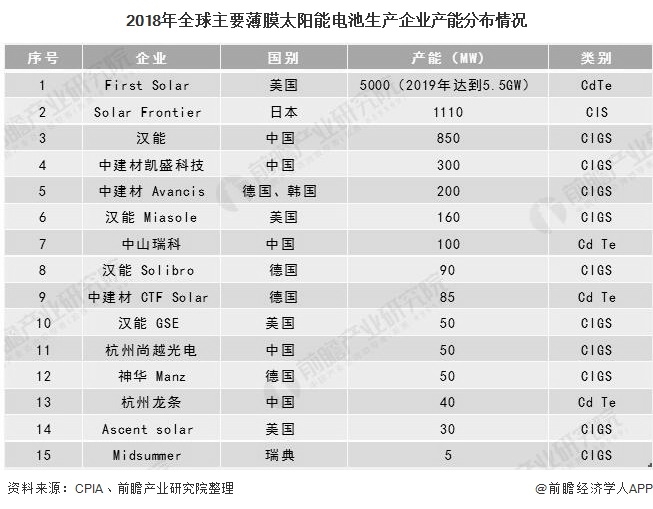 根據(jù)CPIA顯示,2018年First Solar公司的薄膜太陽能電池產(chǎn)能為5GW,到2019年已經(jīng)達(dá)到5.5GW;此外,Solar Frontier公司在2018年薄膜太陽能電池產(chǎn)能也達(dá)到了1.11GW,位于世界前列。