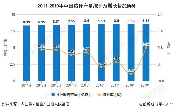 2011年我國(guó)秸稈產(chǎn)量為8.39億噸,前瞻根據(jù)秸稈產(chǎn)量的歷史數(shù)據(jù)并結(jié)合2019年糧食產(chǎn)量數(shù)據(jù),初步估算2019年我國(guó)的秸稈產(chǎn)量約為8.63億噸。