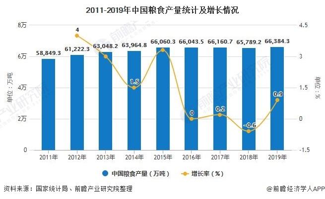 根據(jù)國(guó)家統(tǒng)計(jì)局的數(shù)據(jù)顯示,2011~2019年我國(guó)糧食產(chǎn)量整體呈現(xiàn)波動(dòng)的態(tài)勢(shì),2015年后糧食產(chǎn)量變化波動(dòng)浮動(dòng)不大。2019年我國(guó)糧食產(chǎn)量達(dá)到66384.34萬(wàn)噸,同比增加0.9%。