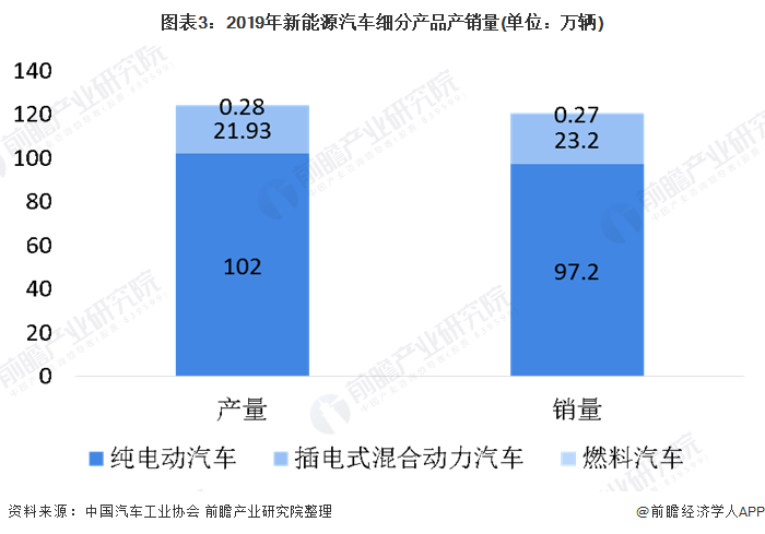 2019年至今,新能源汽車銷售細(xì)分市場(chǎng)格局未發(fā)生改變。2019年新能源汽車銷量中仍以純電動(dòng)汽車銷售為主,為97.2萬(wàn)輛,其次是插電式混合動(dòng)力汽車為23.2萬(wàn)輛。