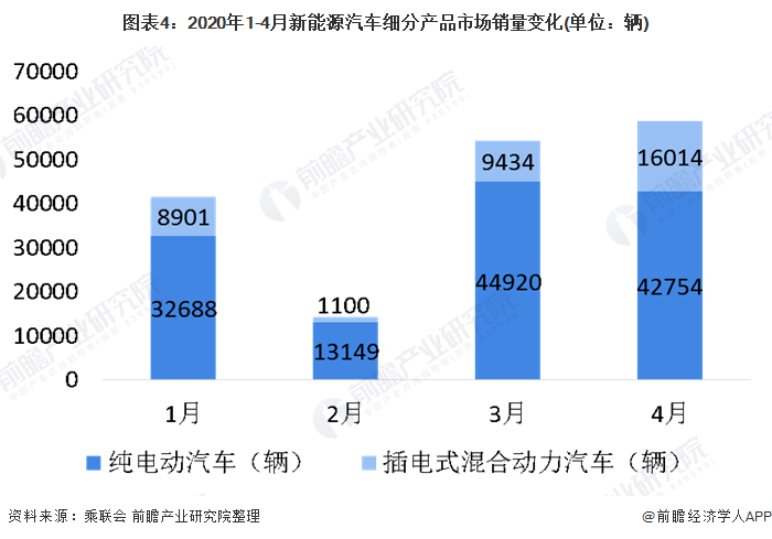 2020年初新冠肺炎疫情全面爆發(fā),亦對(duì)新能源汽車的銷售產(chǎn)生了不小的影響。2020年1-4月中國(guó)新能源汽車市場(chǎng)整體先跌后漲,其中2、3月震蕩較為明顯,4月則小幅增長(zhǎng),達(dá)到2020年1-4月銷量最高值,4月共銷售5.88萬(wàn)輛。