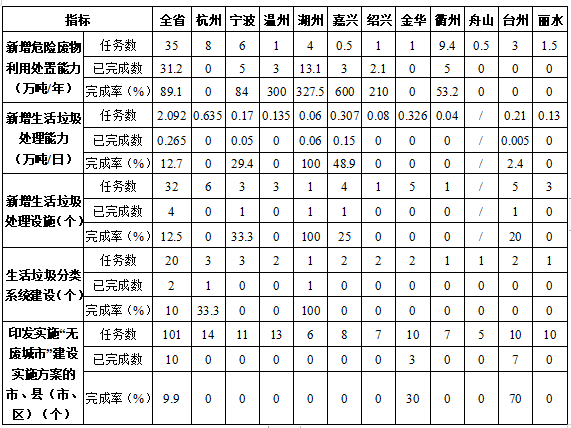截至6月底,全省已完成新增危險廢物利用處置能力31.2萬噸/年,完成率為89.1%;全省已完成新增生活垃圾處理能力0.265萬噸/日,完成率為12.7%;全省已完成新增生活垃圾處理設施4個,完成率為12.5%;全省已完成生活垃圾分類系統(tǒng)建設2個,完成率為10%;全省已有10個市、縣(市、區(qū))印發(fā)實施“無廢城市”建設實施方案,完成率為9.9%。