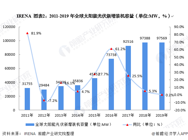 根據(jù)國際可再生能源機(jī)構(gòu)(IRENA)數(shù)據(jù)顯示,2011-2019年全球光伏新增裝機(jī)容量維持上升趨勢,2018年新增裝機(jī)容量為97569MW,較2018年增長0.2%。