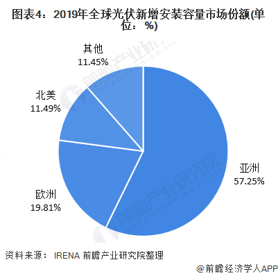 2019年全球光伏新增安裝容量市場份額主要來自于亞洲,亞洲新增安裝容量為55857MW,占比為57.25%。歐洲新增安裝容量為19332MW,占比為19.81%;北美新增安裝容量為11210MW,占比為11.49%。
