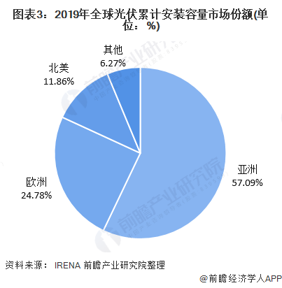 根據(jù)國際可再生能源機(jī)構(gòu)(IRENA)數(shù)據(jù)顯示,2019年全球光伏累計(jì)安裝容量市場份額主要來自于亞洲,亞洲累計(jì)安裝容量為330427MW,占比為57.09%。歐洲累計(jì)安裝容量為138539MW,占比為24.78%;北美累計(jì)安裝容量為68276MW,占比為11.86%。