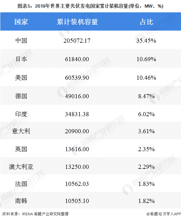 根據(jù)國際可再生能源機(jī)構(gòu)(IRENA)數(shù)據(jù)顯示,從國家來看,2019年世界主要光伏發(fā)電國家累計(jì)裝機(jī)容量中前三分別為:中國、日本、美國。合計(jì)占比達(dá)到56.6%,其中中國占全球比重為35.45%。