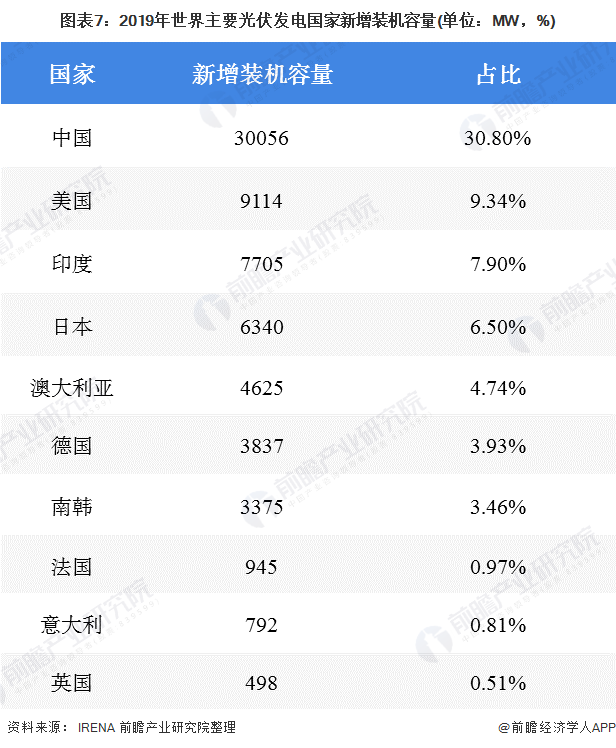 從國家來看,2019年世界主要光伏發(fā)電國家新增裝機(jī)容量中前三分別為:中國、美國、印度,其中中國新增裝機(jī)容量為30056MW,占2019年全球新增裝機(jī)容量比重為30.80%。